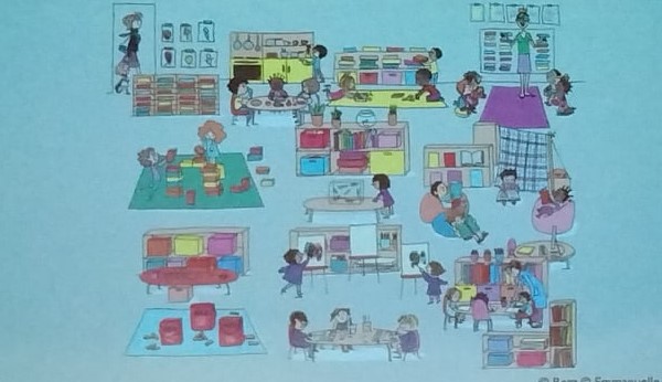 Claudie Méjean met aussi en évidence dans sa conférence l'importance de créer différents espaces et de les délimiter (un espace construction, sensoriel, d'isolement...). Ainsi, les enfants se déplacent et choisissent en fonction du besoin qu'ils ressentent. Si un enfant se rend tout le temps sur le même atelier, l'enseignant peut l'inciter progressivement à se rendre vers d'autres activités. Cette inspectrice de l'Éducation Nationale a également explicité l'importance de mettre un cadre pour que cette pratique fonctionne comme par exemple, limiter le nombre d'enfants, expliquer les règles... L'aménagement peut être limité par l'espace de la classe.